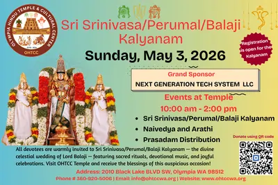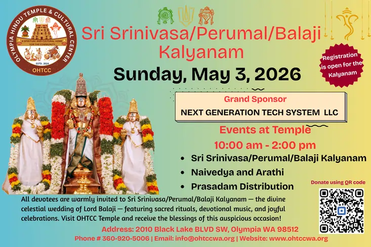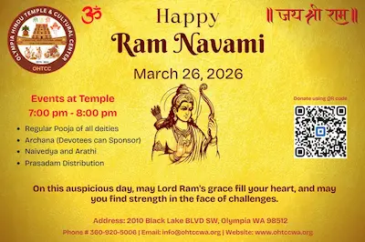 Olympia Hindu Temple & Cultural Center (OHTCC) is home to several deities whose idols are lovingly enshrined in the temple sanctum. The idols of Lord Ganesha, Lord Murugan/Karthikeya with Sri Valli and Devasena, Lord Venkateshwara with Sri Devi and Bhoodevi, and Lord Shiva were installed on Thursday, August 29, 2024 — a meaningful spiritual milestone for our community. The idols of Lord Hanuman and Goddess Durga Devi were installed on Saturday, May 31, 2025, followed by the idol of Lord Saibaba on Thursday, July 31, 2025.